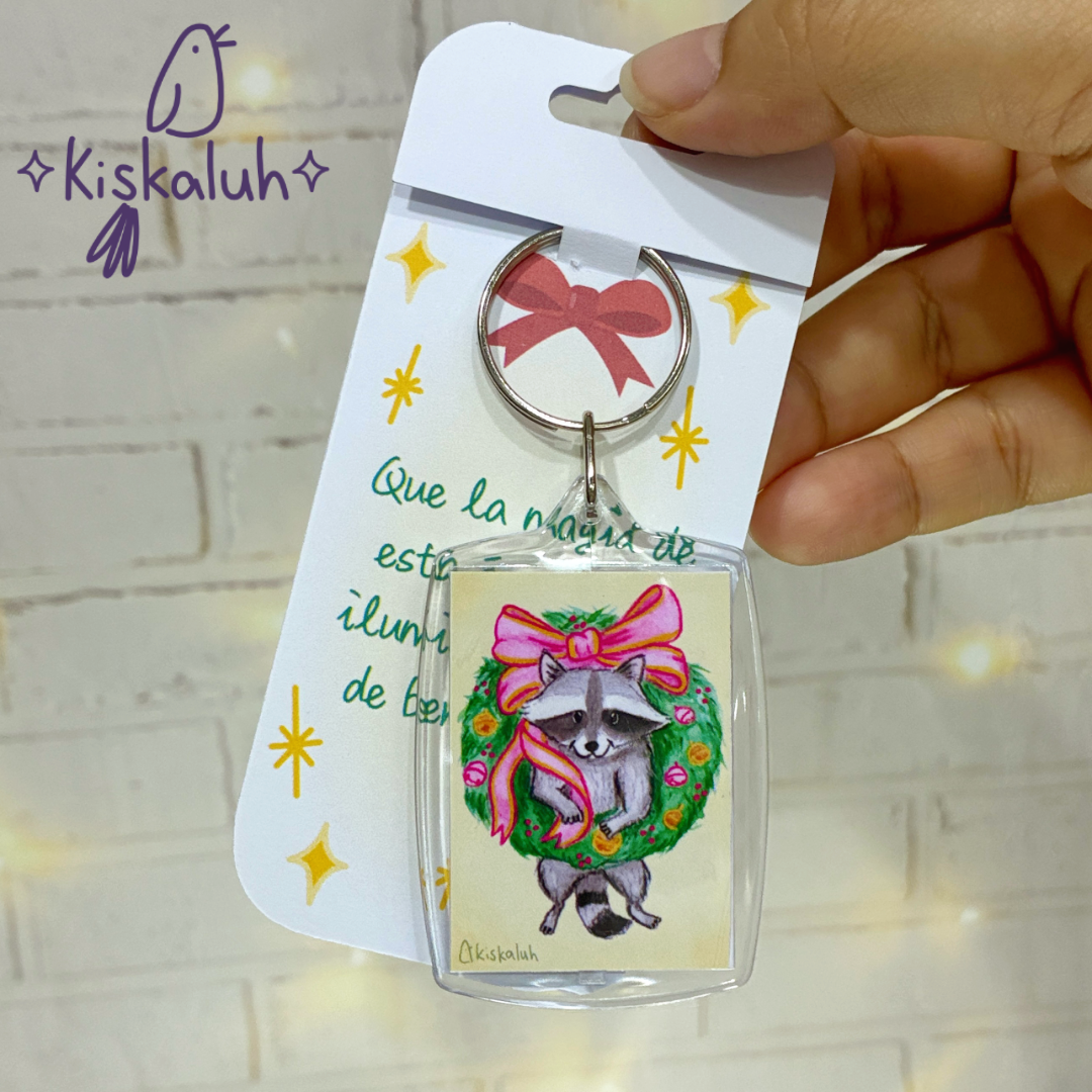 Llavero acrílico con una mini ilustración de Kiskaluh en la parte frontal. En la parte trasera lleva la frase “Felices Fiestas”.
