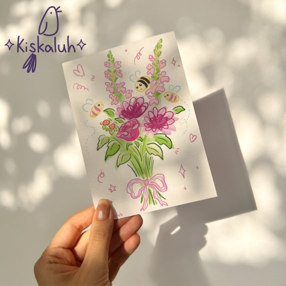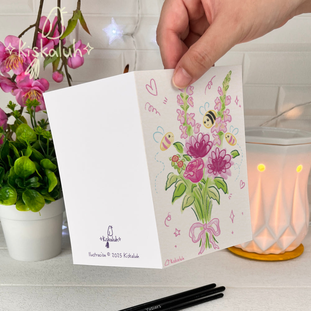 Tarjeta de felicitación con ilustración de un ramo de flores en tonos rosas con abejitas