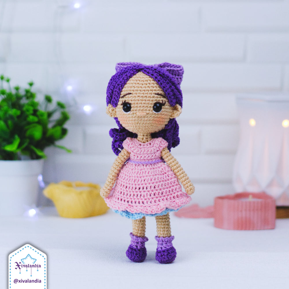 - Muñeca tejida con tonos rosas y morados, crochet artesanal, amigurumi